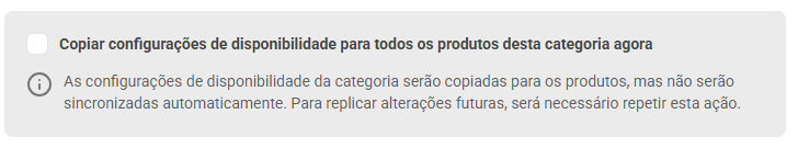 Por fim, você verá uma opção para transferir as configurações de disponibilidade para todos os produtos vinculados à categoria. Marque-a antes de salvar as configurações:
