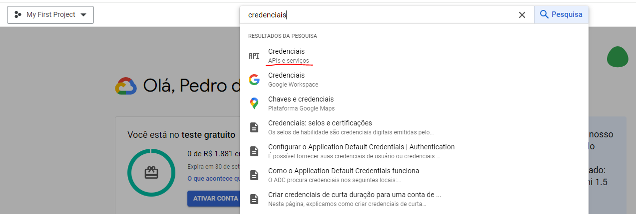 A tela seguinte é o painel de controle do Google Cloud, na barra de pesquisa, digite "credenciais" e clique na opção API: