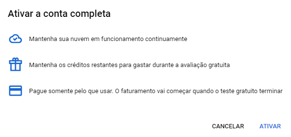 Depois, volte a tela inicial, clicando na logo do Google Cloud e clique em "Ativar conta completa", se ainda não estiver ativada: