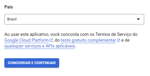 Selecione o país (Brasil) e clique em "Concordar e Continuar":