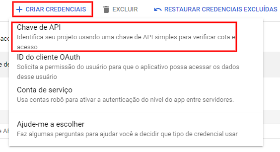 Em seguida, clique em "Criar credenciais" em seguida em "Chave API":