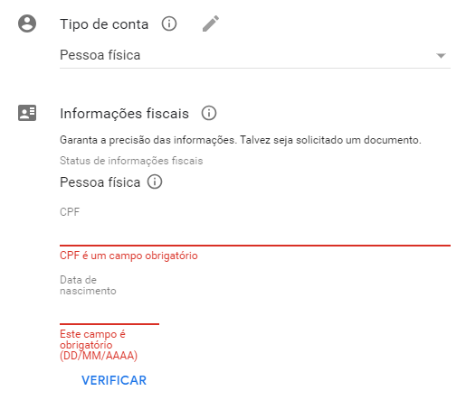 Selecione "Organização" para CNPJ e "Pessoa Física" para CPF. Preencha os dados e clique em "Verificar":